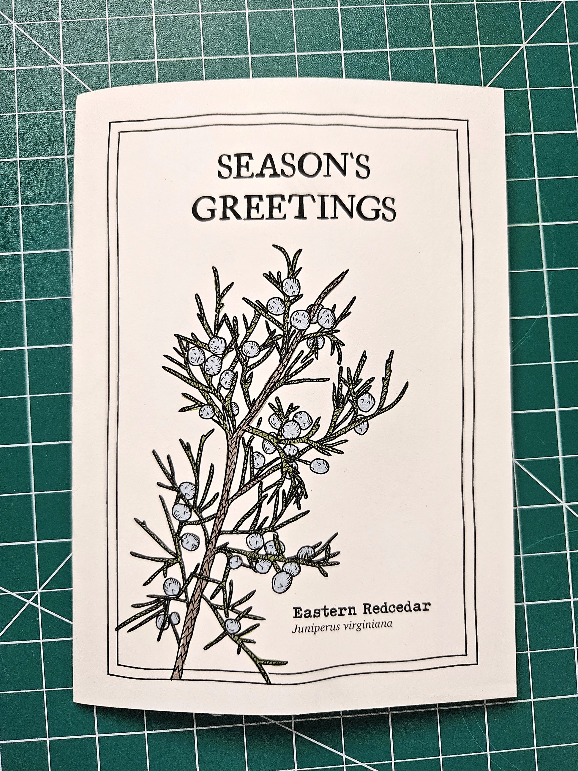 Holiday greeting card featuring an Eastern Redcedar sprig. Blank inside. Envelope included.